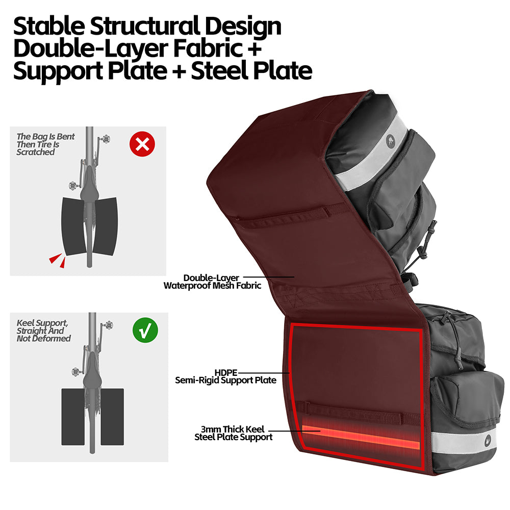 Crafted with three-layer composite material and double-layer waterproof mesh fabric, these panniers shield gear from rain, mud, and splashes. A bonus rain cover adds extra protection during heavy rain, while the surface easily rinses clean after messy rides — ensuring longevity and hassle-free maintenance.