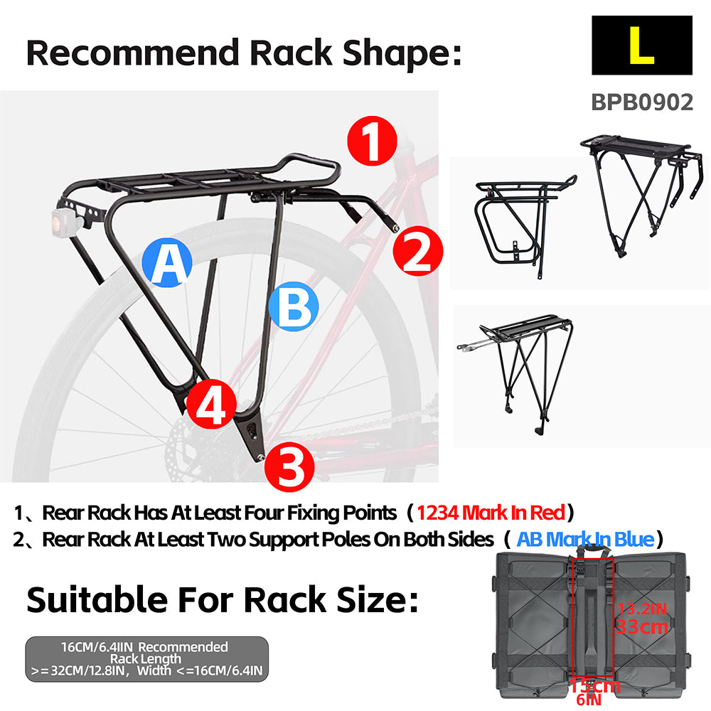 - L (BPB0902): 20+20L total | ~2200g | Perfect for multi-day tours. Compatible with racks ≥32cm long & ≤16cm wide.