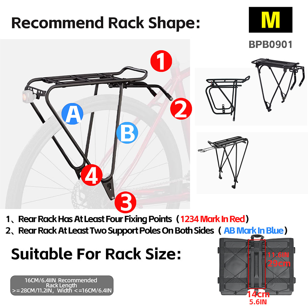 - M (BPB0901): 11+11L total | ~1900g | Ideal for day trips or light packing. Compatible with racks ≥28cm long & ≤16cm wide.