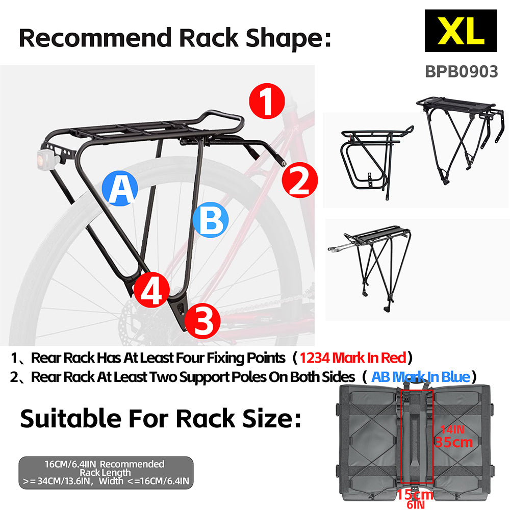 - XL (BPB0903): 25+25L total | ~2560g | Built for extended expeditions. Compatible with racks ≥34cm long & ≤16cm wide.