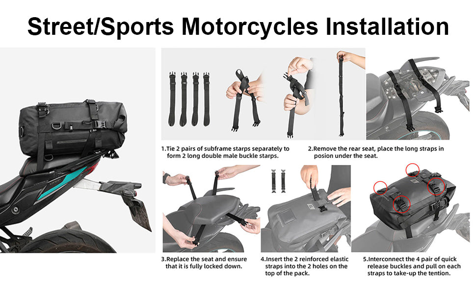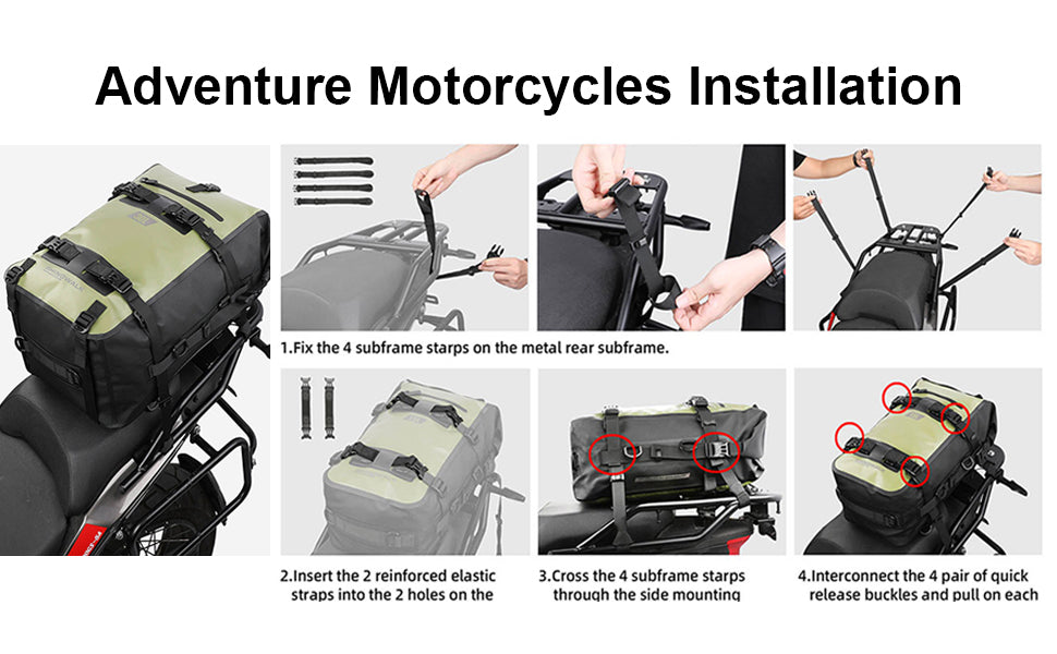 - ✔ Excellent waterproof property: the motorcycle bag is made of farbric waterproof and tear resistant PVC coated polyester. All joints of the bag body are treated with seamless sealing process, and the full waterproof fabric is used to prevent rainwater infiltration. The surface and bottom are provided with waterproof adhesive layer, which can be directly flushed with water.