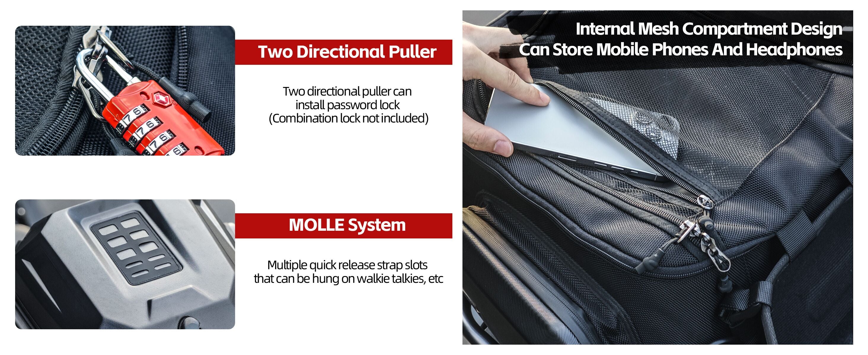 - MOLLE system lets you attach walkie - talkies and extra gear.