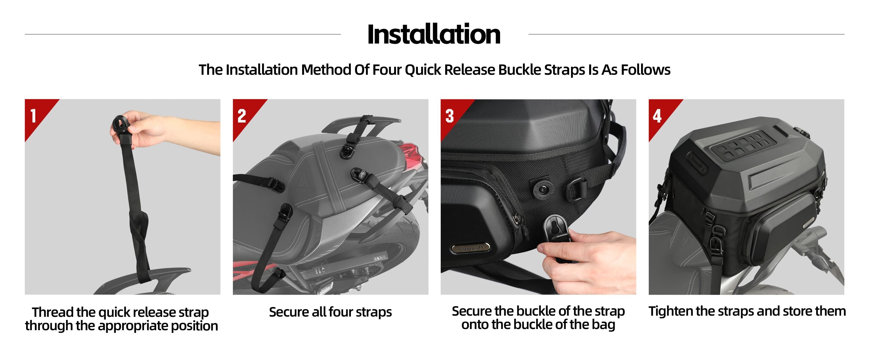 Four quick - release buckle straps make mounting a breeze—thread, secure, buckle, and tighten. Get set for the road in minutes.