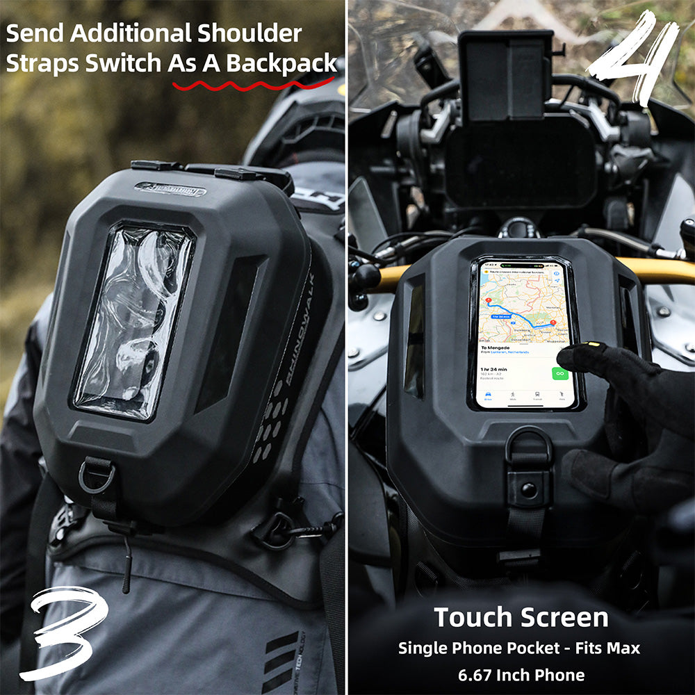 Ideal for long rides, off-road adventures, or daily commutes—this tank bag combines durability, convenience, and weather resistance to keep your gear organized and accessible.