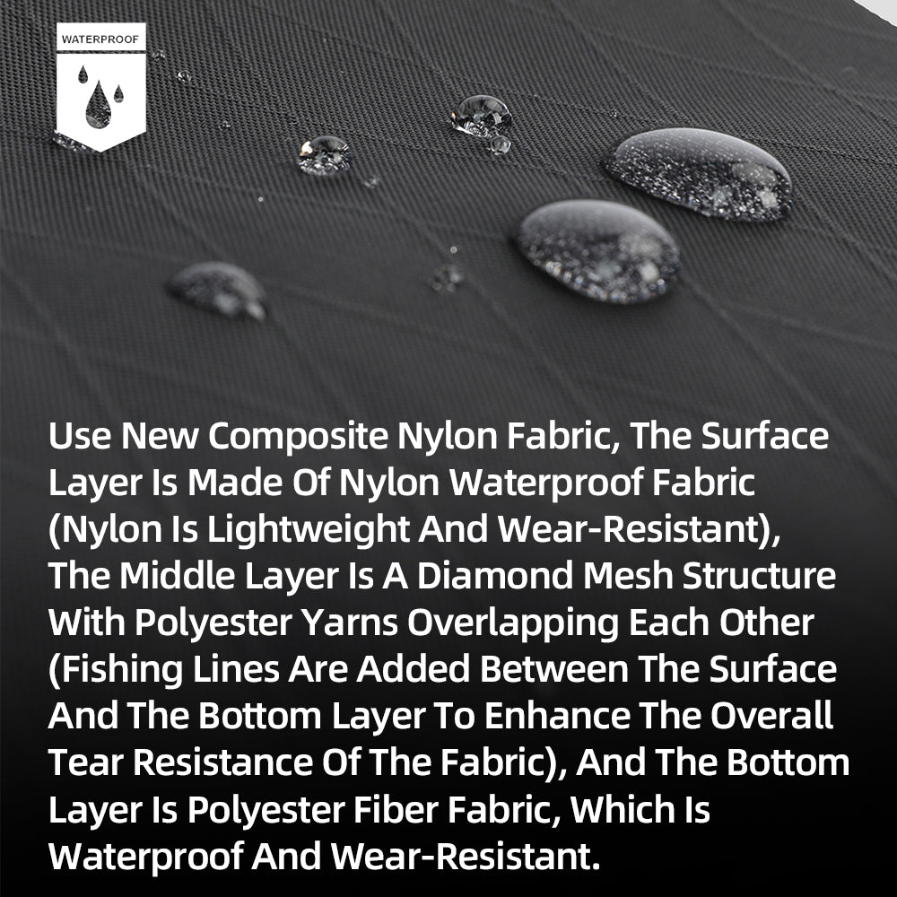 - Multi-layer composite nylon fabric (waterproof outer layer + reinforced diamond mesh middle + wear-resistant polyester base) shields gear from rain and debris.